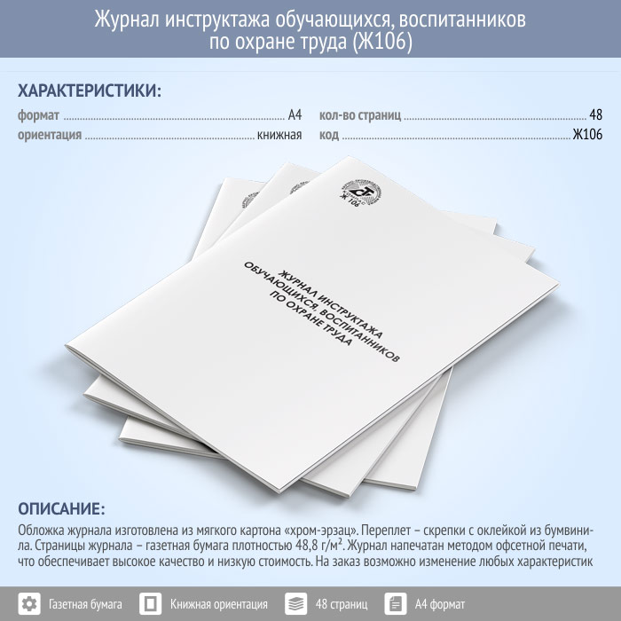Журнал инструктажа обучающихся, воспитанников по охране труда (48 стр., Ж106) в Обнинске купить