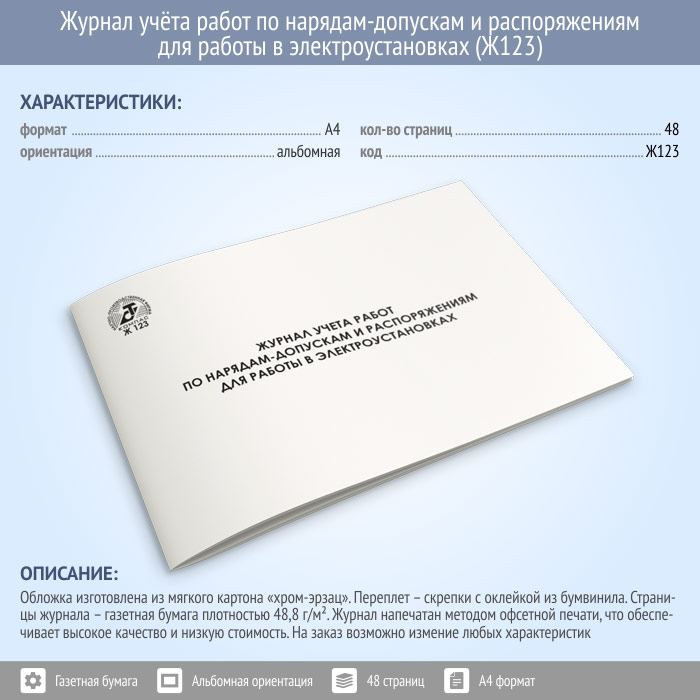 Журнал учета работ по нарядам-допускам и распоряжениям для работы в электроустановках (48 стр., Ж123) в Обнинске купить