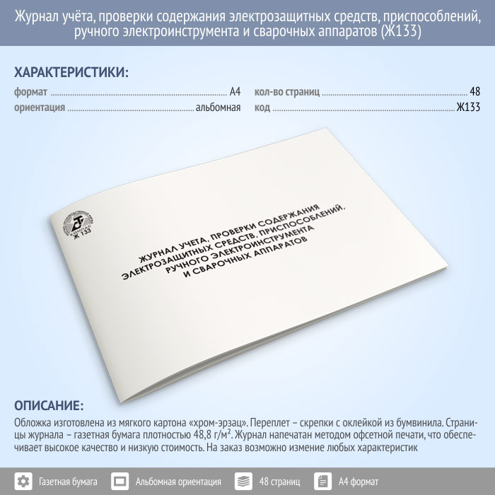 Журнал учета проверки и содержания электрозащитных средств, приспособлений, ручного электроинструмента и сварочных аппаратов (48 стр., Ж133) в Обнинске купить