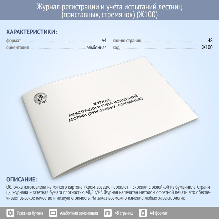 Журнал регистрации и учета испытаний лестниц (приставных, стремянок) (48 стр., Ж100) в Обнинске купить