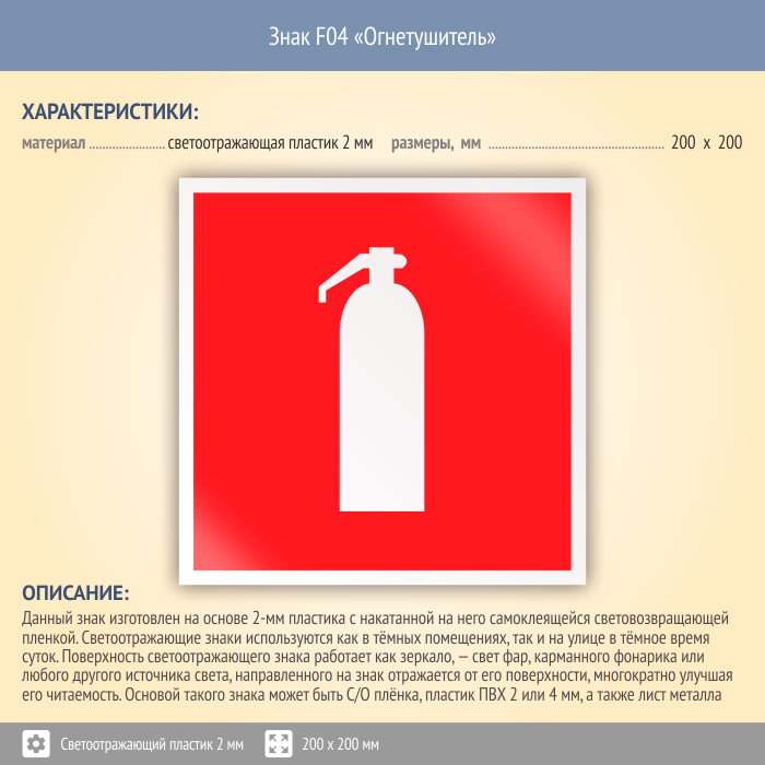 Знак F04 «Огнетушитель» (светоотражающий пластик, 200х200 мм) в Обнинске купить